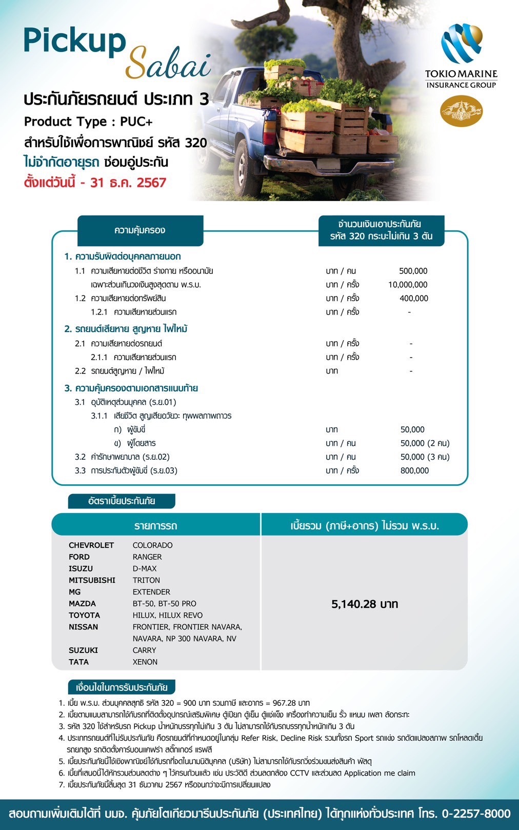 แผนความคุ้มครองนี้ออกแบบมาให้สอดคล้องกับการใช้งานรถกระบะเชิงพาณิชย์ โดยให้ความคุ้มครองครอบคลุมในส่วนของความเสียหายต่อทรัพย์สินและความรับผิดชอบต่อบุคคลภายนอก บริษัทประกันภัย โตเกียวมารีน คุ้มภัย เป็นผู้รับประกันภัย โดยเปิดรับทำประกันสำหรับรถทุกประเภทที่มีการติดตั้งระบบทำความเย็น เช่น ตู้เย็น ตู้แช่ ตู้เปียก รวมถึงรถที่มีการดัดแปลงด้วยการติดตั้งแหนบ เพลา หรือล้อกระทะเพื่อรองรับการใช้งานหนัก