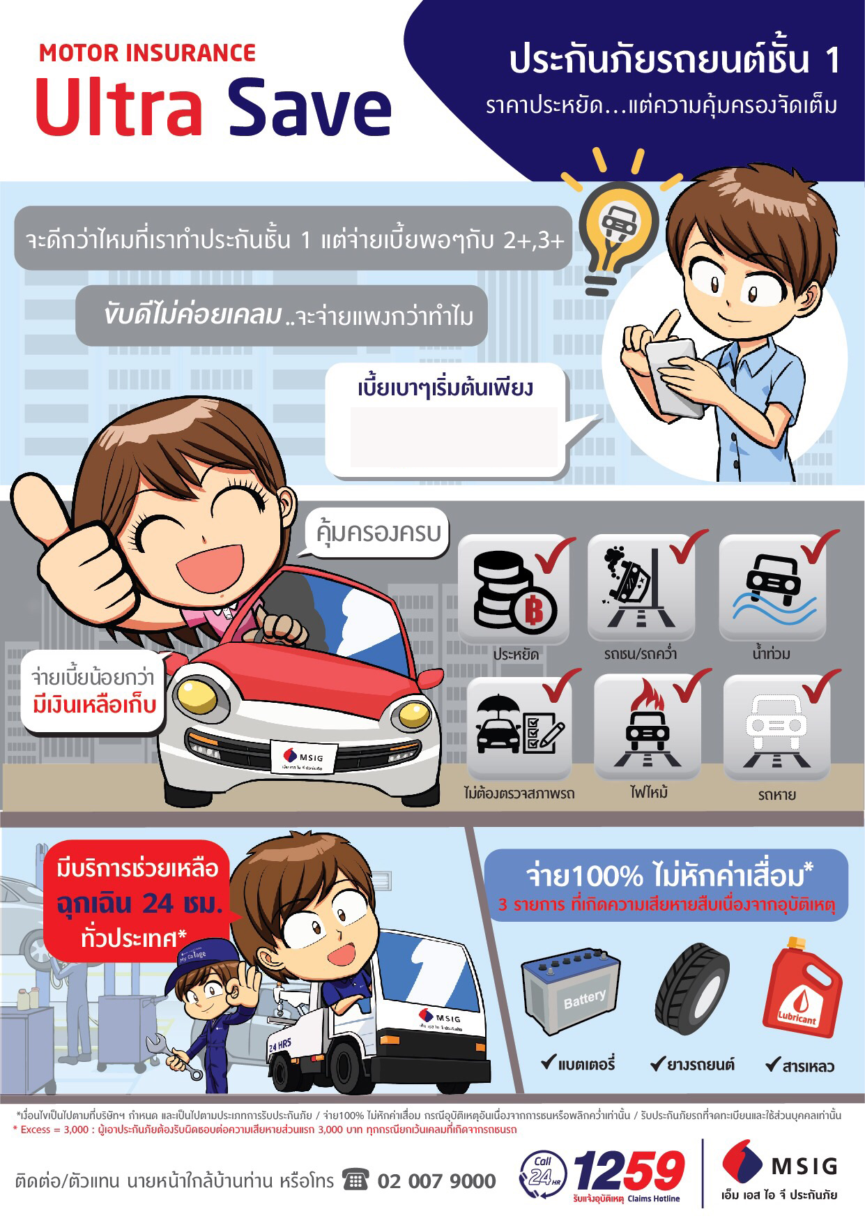 *Excess = 3,000 บาท กรณีผู้เอาประกันภัยรับผิดชอบความเสียหายส่วนเเรก 3,000 บาท ทุกกรณี **ยกเว้นเคลมที่เกิดจากรถชนรถ